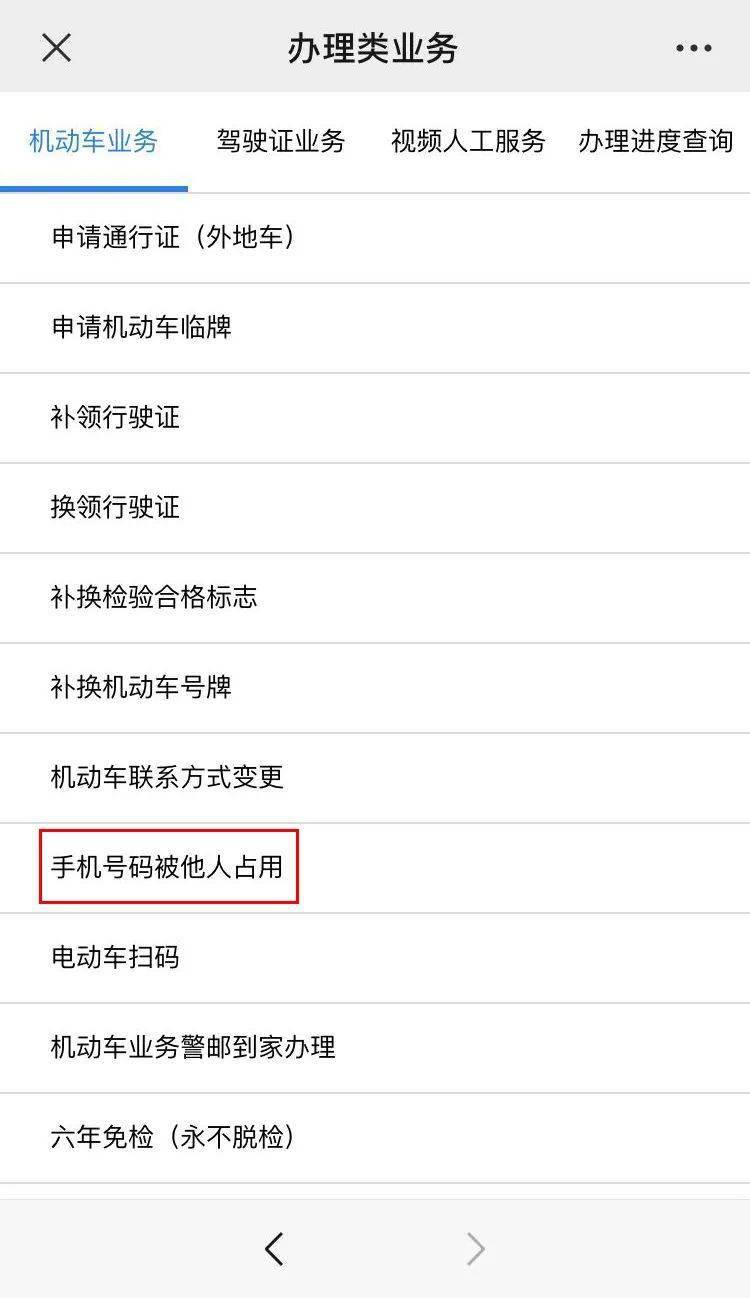 成功登录后,在首页选择“车驾管办理类服务”,跳转后,选择“手机号码被他人占用”;